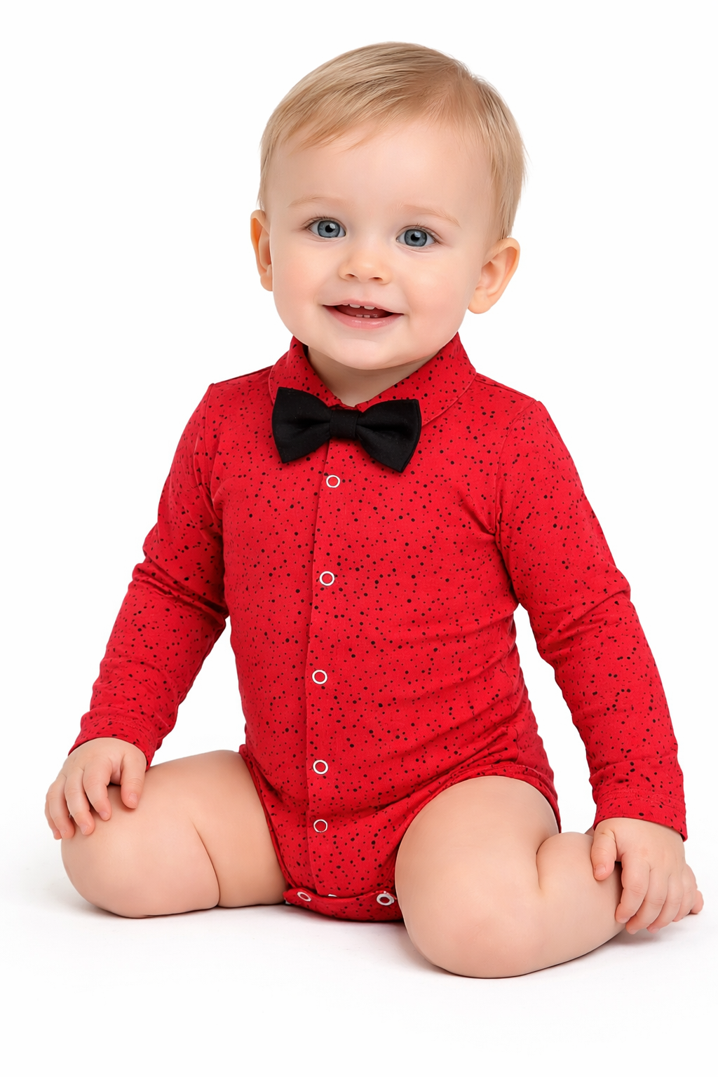 Body koszulowe zapinane na bezniklowe napki, z przodu oraz w kroku. Klasyczny kołnierzyk. Rękaw wykończony mankietem.