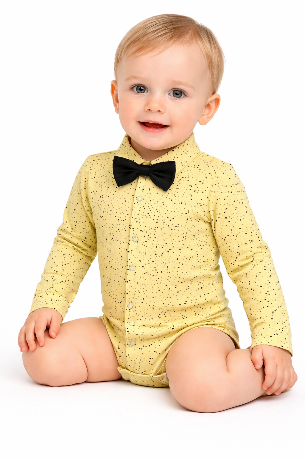 Body koszulowe zapinane na bezniklowe napki, z przodu oraz w kroku. Klasyczny kołnierzyk. Rękaw wykończony mankietem.