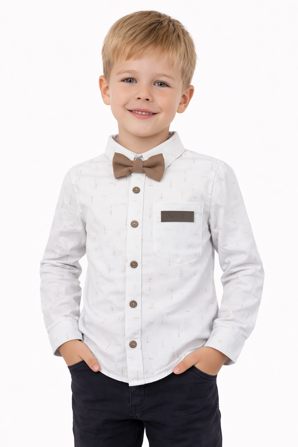 W tej części naszego sklepu internetowego znajduje się szeroki wybór odzieży dziecięcej od marki Wowile. Od razu rzuca się tu w oczy szeroki wybór garniturków do chrztu, koszulobody i eleganckich zestawów dla chłopców w wieku do około 2-3 lat. Wyjściowe ubrania znajdą tu dla siebie również starsze dzieci. Asortyment obejmuje zarówno klasyczne, białe koszule wizytowe z doszytą muszką, jak i odzież w kontrastujące ze sobą kolory i wzory. Dzięki temu znajdzie się tu coś odpowiedniego zarówno na uroczystą szkolną akademię, jak i na nieco luźniejsze przyjęcie urodzinowe, na którym wciąż jednak wypada wyglądać elegancko.
