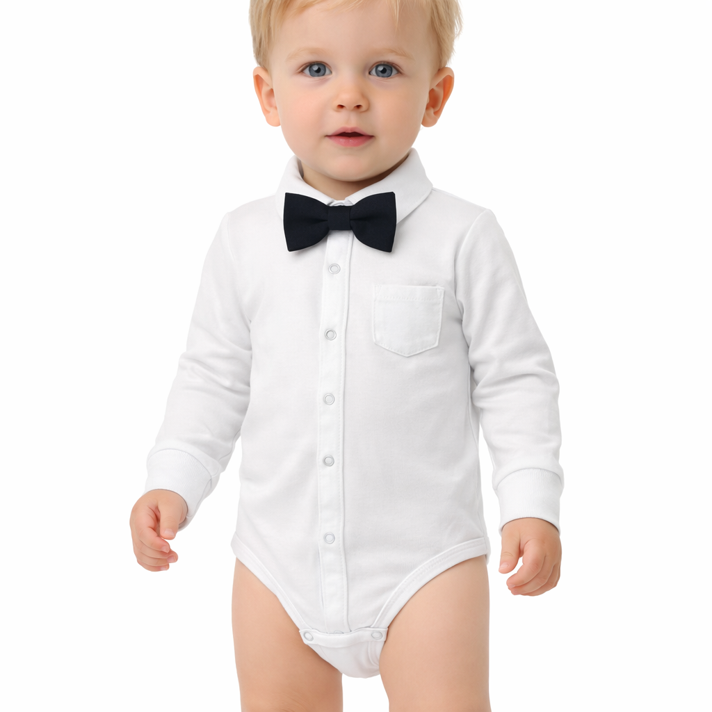 Body koszulowe kolor biały zapinane na bezniklowe napki z przodu oraz w kroku.Klasyczny kołnierzyk. Na lewym boku ozdobna kieszonka. Rękawy wykończone mankietem. Polska bawełna 100%