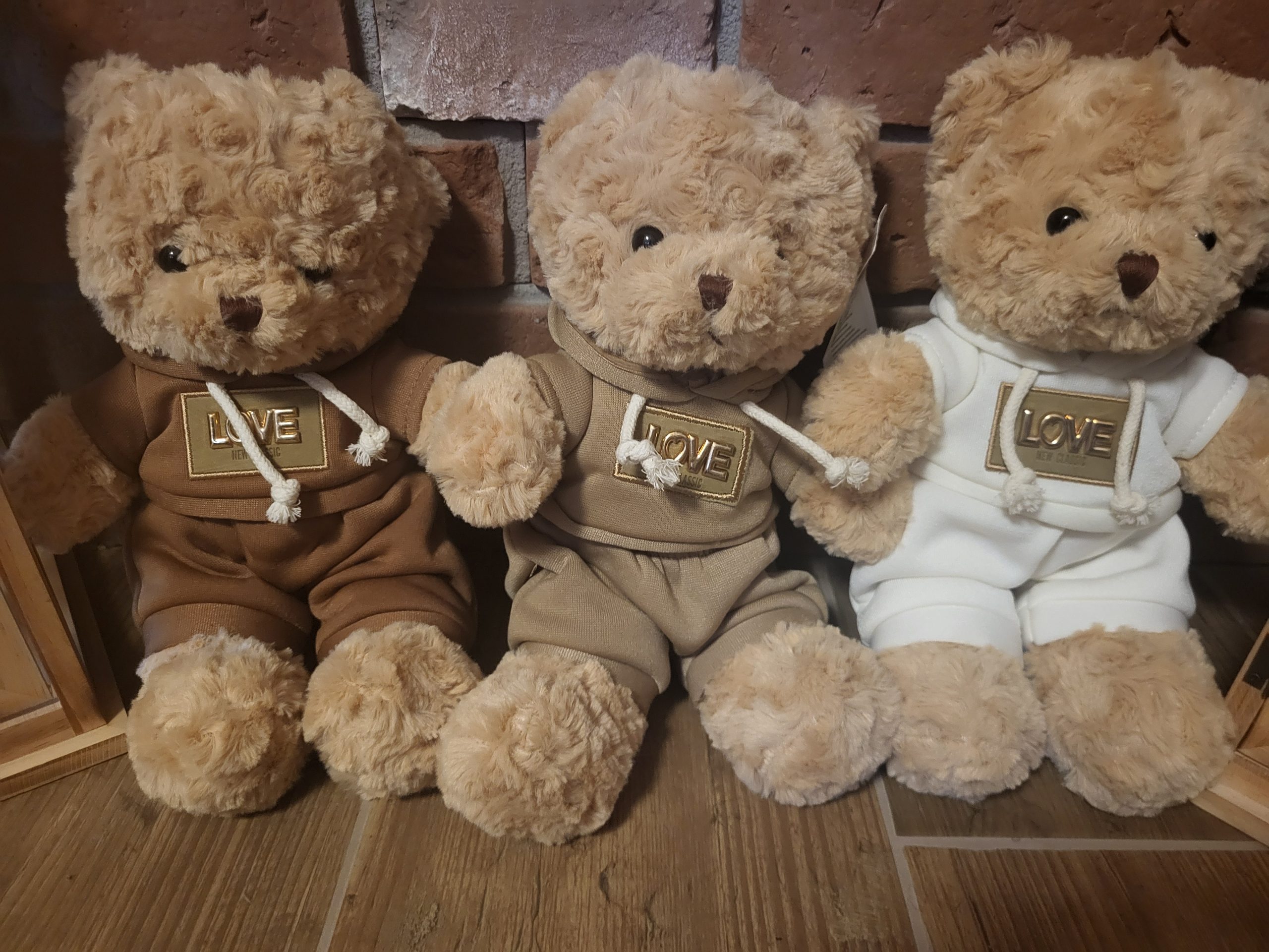 Śliczny pluszowy miś o wysokości 30 cm, ubrany w stylowy dresik w kolorze beżowym. Dresik można zdejmować, co pozwala na zabawę w przebieranie i dodaje uroku tej przytulance.